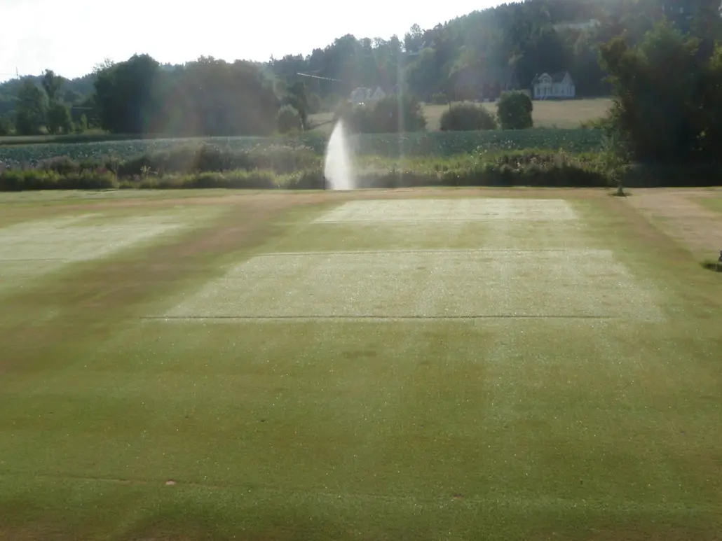 This project was started in May 2014 on a USGA-spec. green with a one year old cover of creeping bentgrass Bioforsk Landvik, Norway. The trial followed a split plot design with four replicates; two irrigation regimes on main plots and surfactants (No surfactant control, Qualibra and Revolution) on subplots. The irrigation regimes were ‘FC x 1’ (=irrigation to field capacity once a week) , and ‘Excess x 2’ (=irrigation twice per week with 50% more water than needed to replenish FC). The plots were irrigated using a manually operated irrigation boom, the amount of water to being calcaluated from TDR measurements (20 cm depth) and an anticpated soil water content at FC of 20 %. Both surfactants were applied at a rate 20 L in 800 L water ha-1 at monthly intervals from 1 May to 1 September.